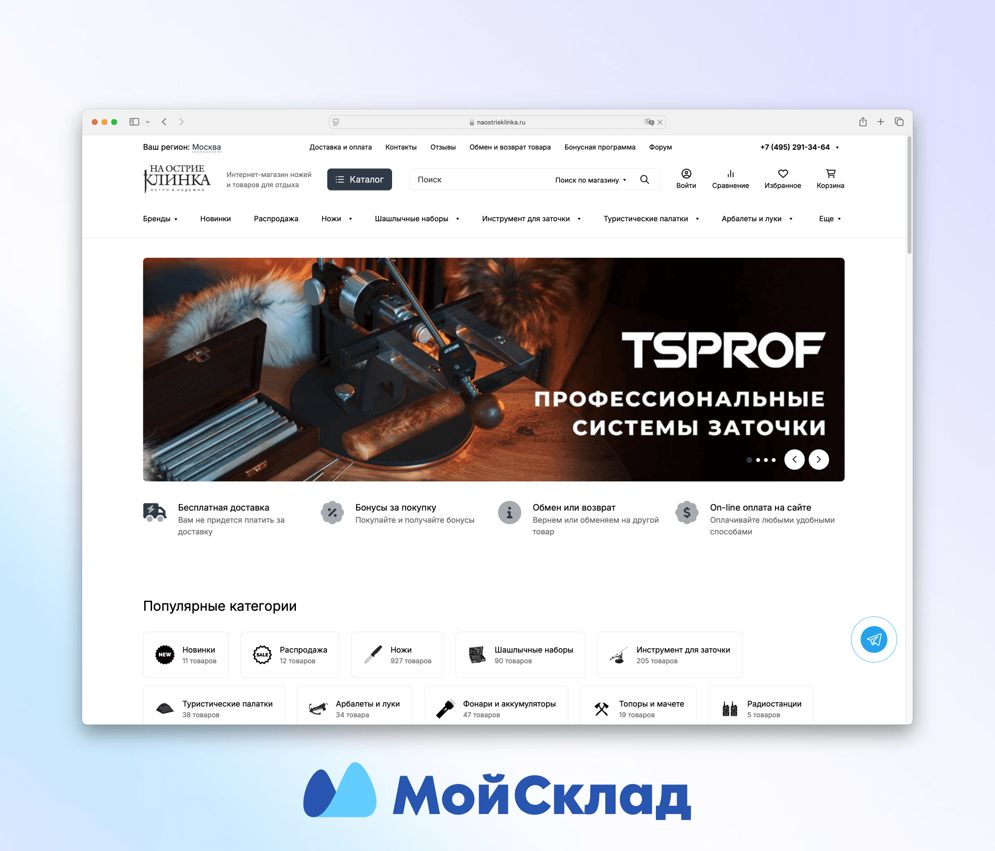 Case study on implementing the "MoySklad" service with an online store for knives, sharpening tools, and outdoor goods on the Webasyst CMS Shop-Script platform